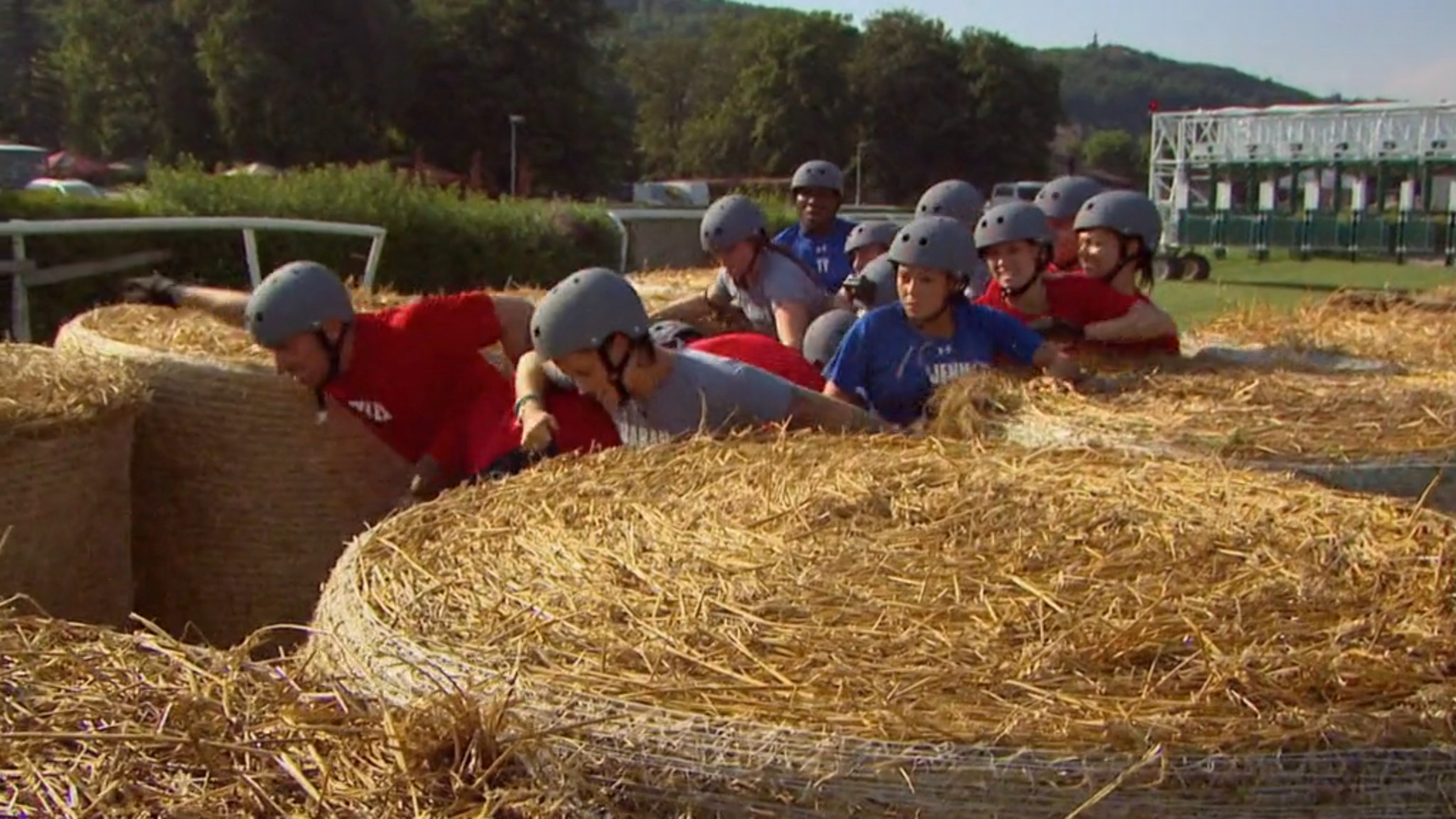 This competition required teams to escape from a pit by any means necessary. While they were able to get the majority of the team out by climbing on each other and using cheerleading strategies, the final couple of people needed to think outside the box. The veterans failed, but climbing master Alton figured out how to get it done.