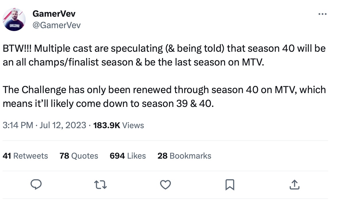 Gamer later said that he can’t see MTV abandoning the show after season 40, implying this rumor could just be a ploy to garner interest from prior winners. I suppose this could be true, but I’m more inclined to disagree with Gamer here.