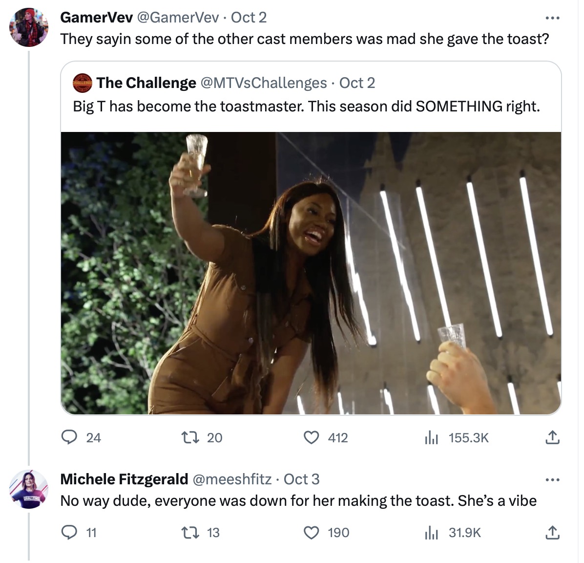 This is when Big T jumped into the conversation, saying Michele made sure she didn’t do the toast “the second time,” implying there is more than one toast.