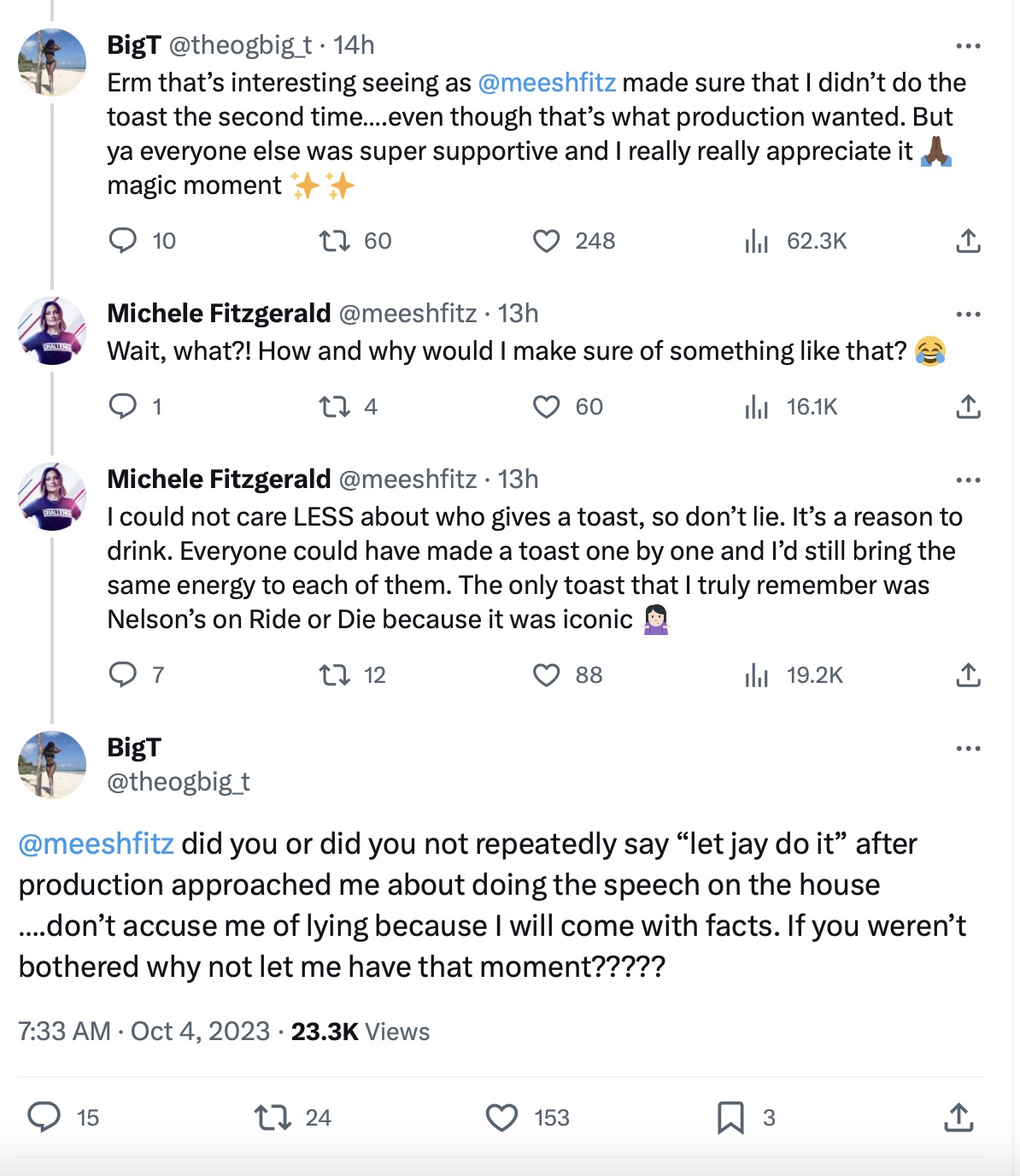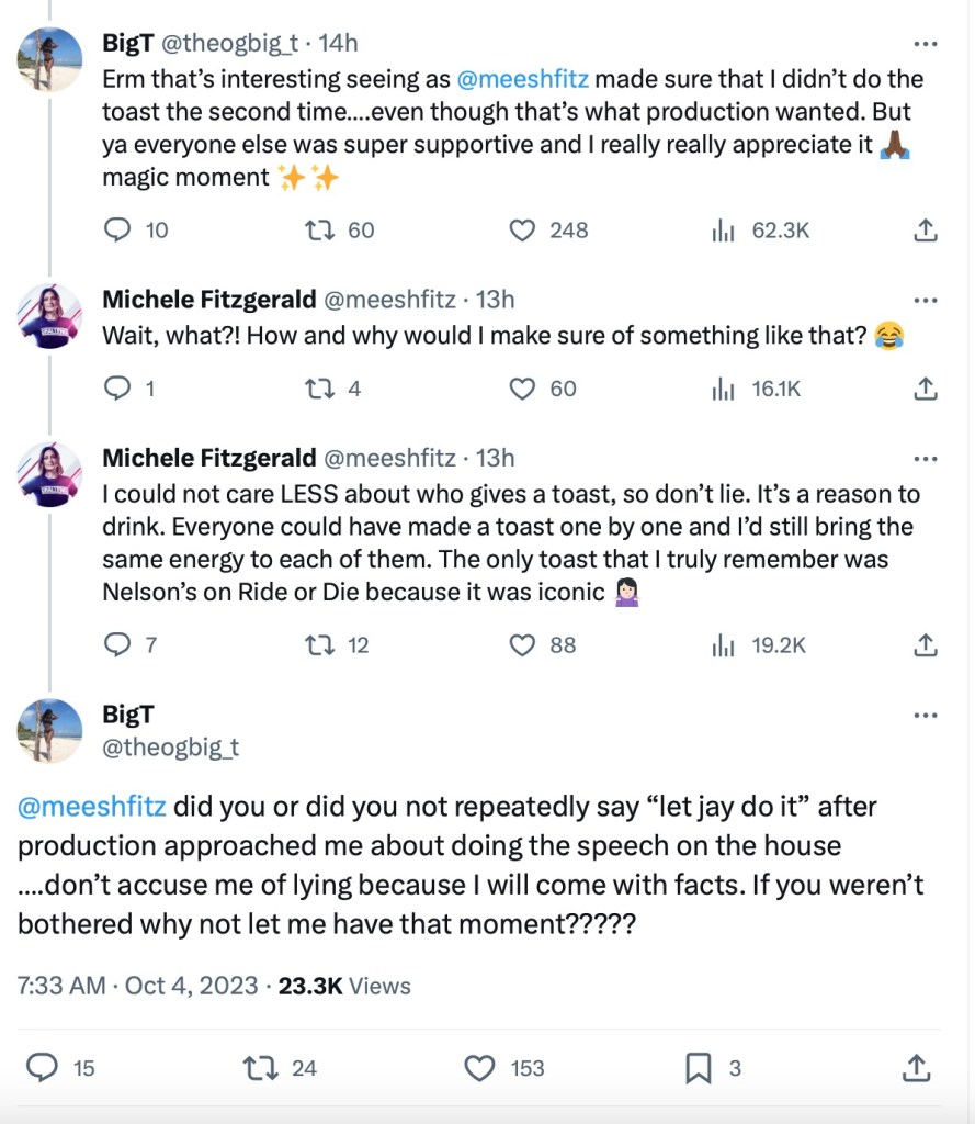 Michele denied this and claimed she had no power to prevent Big T from making a toast, but Big T refuted that. She stated that Michele wanted Jay to give the toast, even though production asked her to speak to the group.