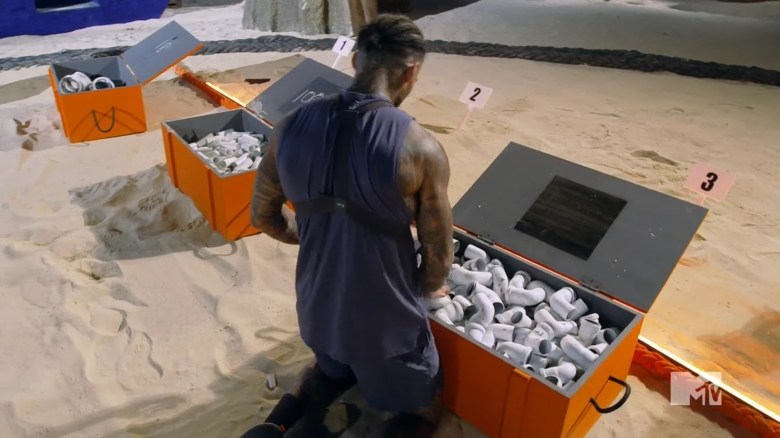 Emanuel and Corey are in the sand at The Arena, and TJ brings out Devin. The cast is surprised, but Devin really brings the drama when he pulls the mysterious third pole at The Draw. This says “chaos” on it, and it means he can pick any male — aside from the winners — as his opponent. He asks the Challengers for opinions, and they mostly say Corey’s name. Then, out of the blue, he calls out Callum. Fittingly, the elimination is called Totally Mental.