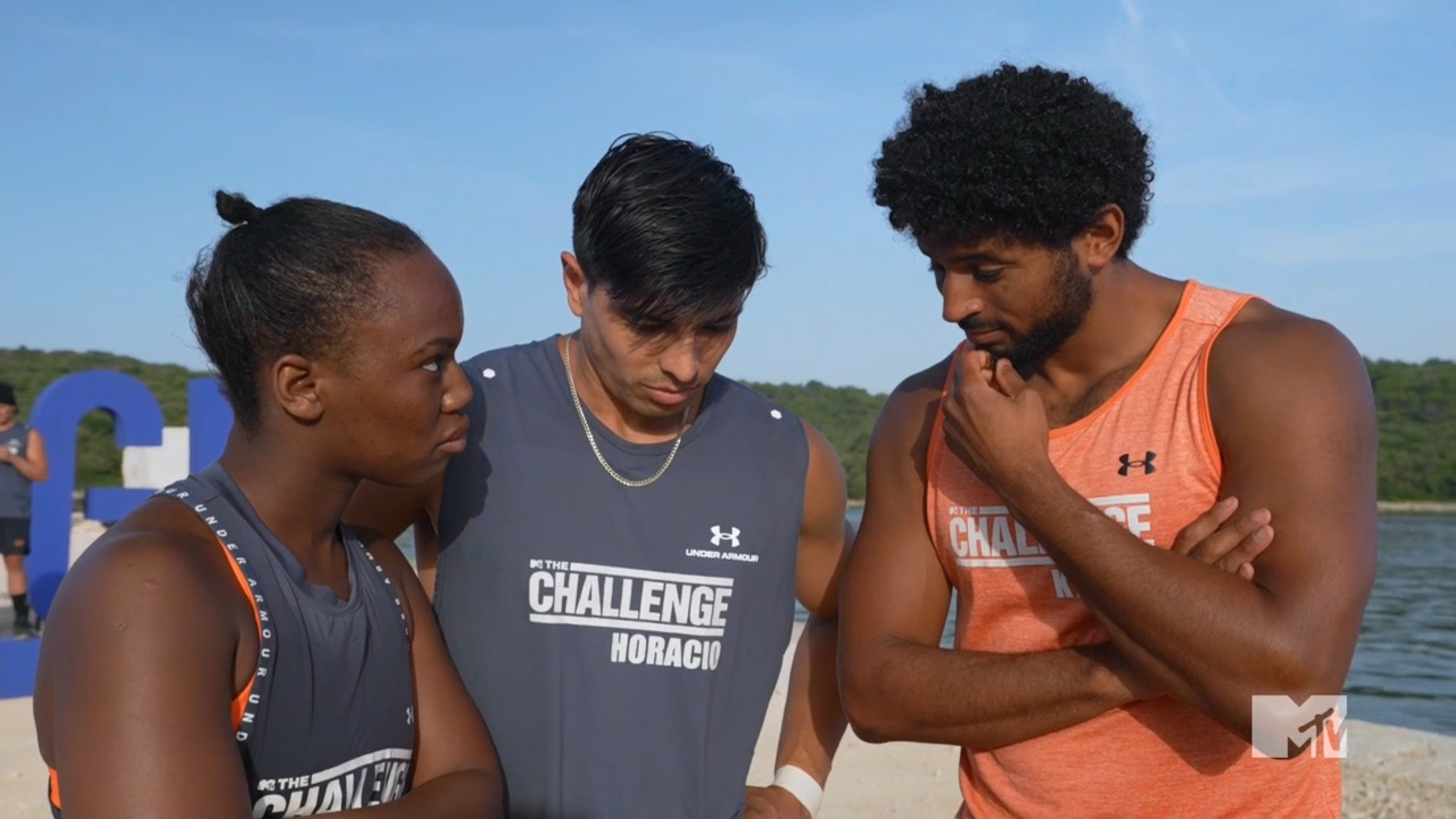 Emanuel and Corey are in the sand at The Arena, and TJ brings out Devin. The cast is surprised, but Devin really brings the drama when he pulls the mysterious third pole at The Draw. This says “chaos” on it, and it means he can pick any male — aside from the winners — as his opponent. He asks the Challengers for opinions, and they mostly say Corey’s name. Then, out of the blue, he calls out Callum. Fittingly, the elimination is called Totally Mental.