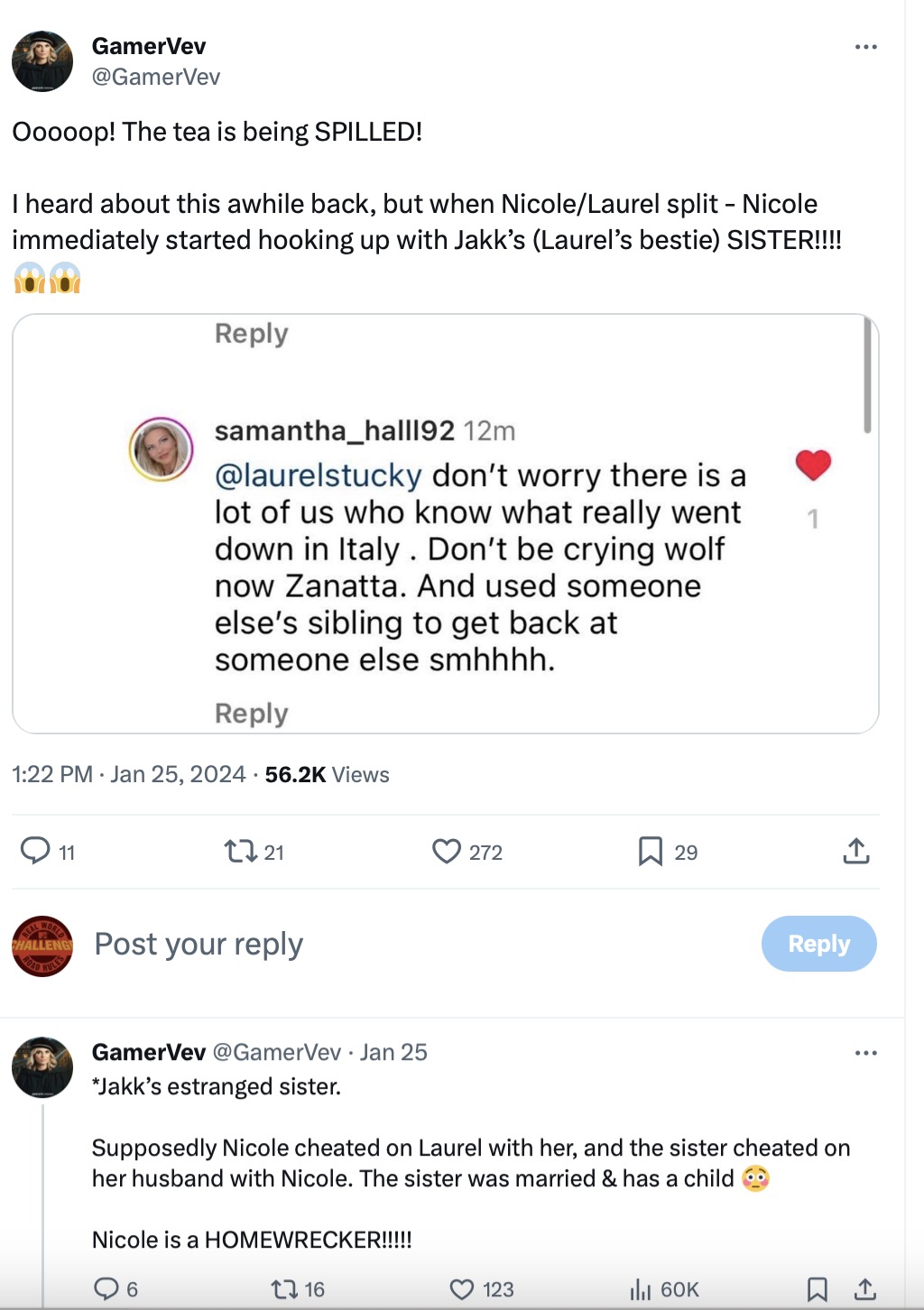 According to Gamer, Nicole cheated on Laurel with Jakk’s estranged sister who had a husband and child.