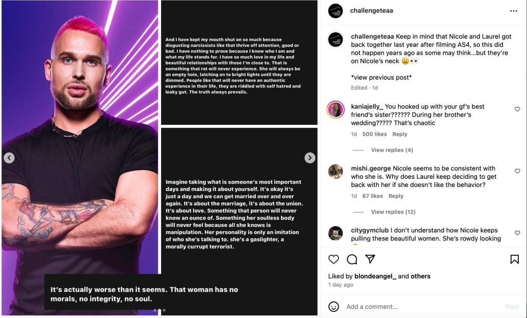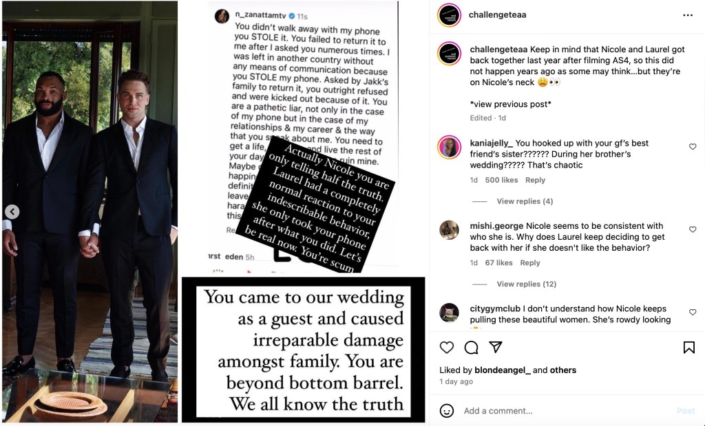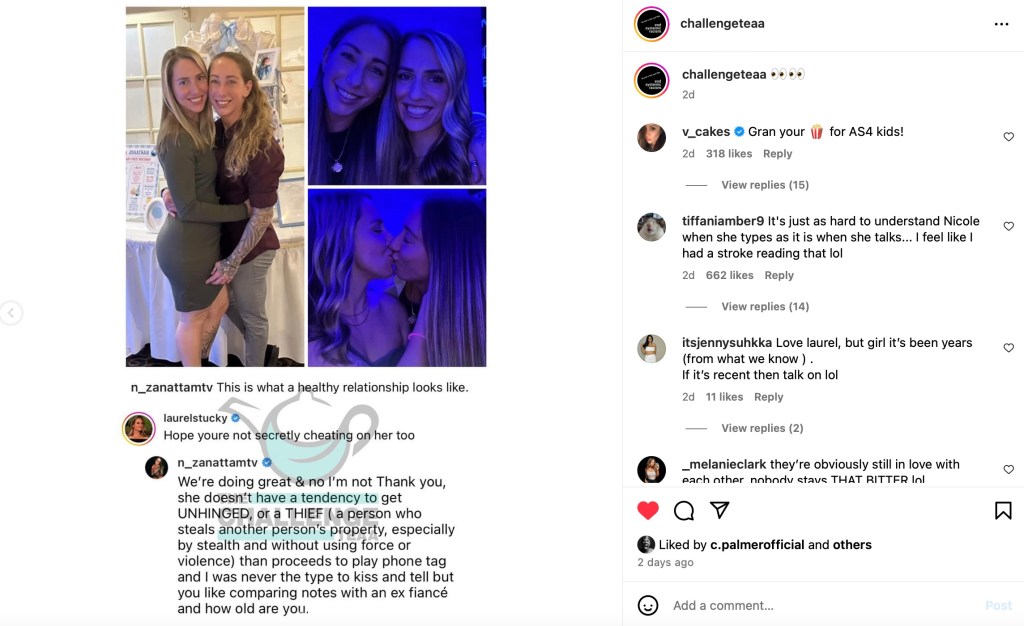 Well, the drama started emerging online when Nicole posted a photo of herself with her current girlfriend and Laurel said “hope you’re not secretly cheating on her too” in a now-deleted comment (archived by @ChallengeTeaa)