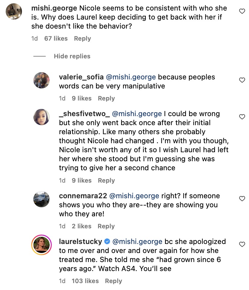 Some people have asked the obvious: WHY did Laurel even give Nicole another chance in the first place. Laurel responded to a comment and stated that Nicole went to therapy to work on herself, but we’ll get more details on All Stars 4.