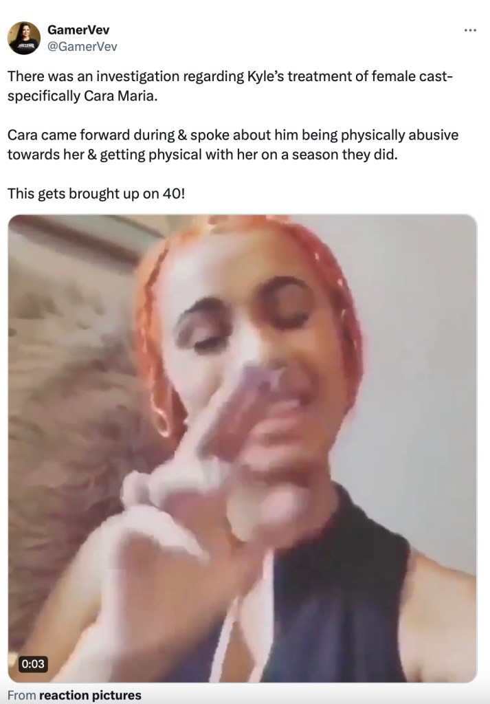 According to spoiler account Gamer, Kyle hasn’t been on the cast because of allegations that he was abusive to female cast members on the show — particularly Cara Maria. Following these accusations, production hasn’t invited him to return as they investigate the claims.