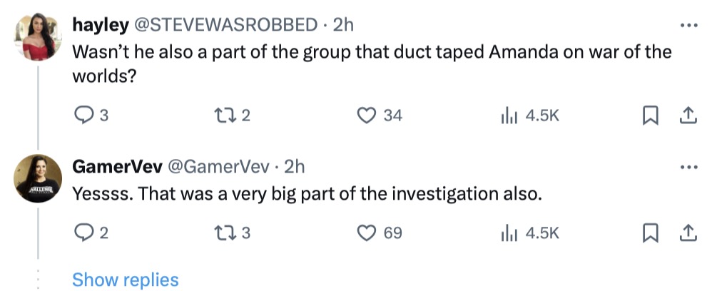 Apparently, the duct tape incident on War of the Worlds — where three male cast members wrapped Amanda in tape as a joke — was cited as a piece of evidence.