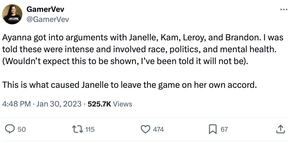 When the season was filming, 15 months ago, Gamer revealed the argument was much more controversial. Apparently, Ayanna was discussing real-world issues involving race, politics, and mental health. Jasmine also alluded to this.