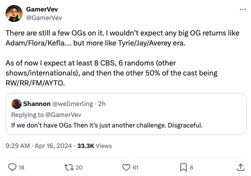 I find it hard to believe that they can’t find enough OG’s to be on the show. They need to ask everyone that has been on the old Challenges before they start with newer people or ones from other shows. That’s what makes All Stars the best. I want old school challengers not new ones.