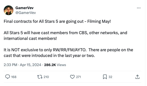 Well, it looks like All Stars may be taking a turn for the worse. Spoiler account Gamer is reporting that production has been sending out contracts for season 5, and some of the competitors will be people who are very new to the franchise.
