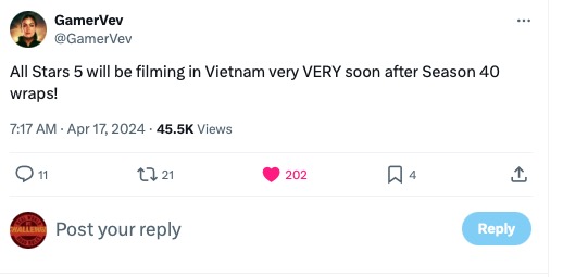 Gamer also stated the show will film in Vietnam in May, very shortly after Season 40 is done with production. So, it’s likely All Stars 5 will be filmed in the same location as the flagship show.