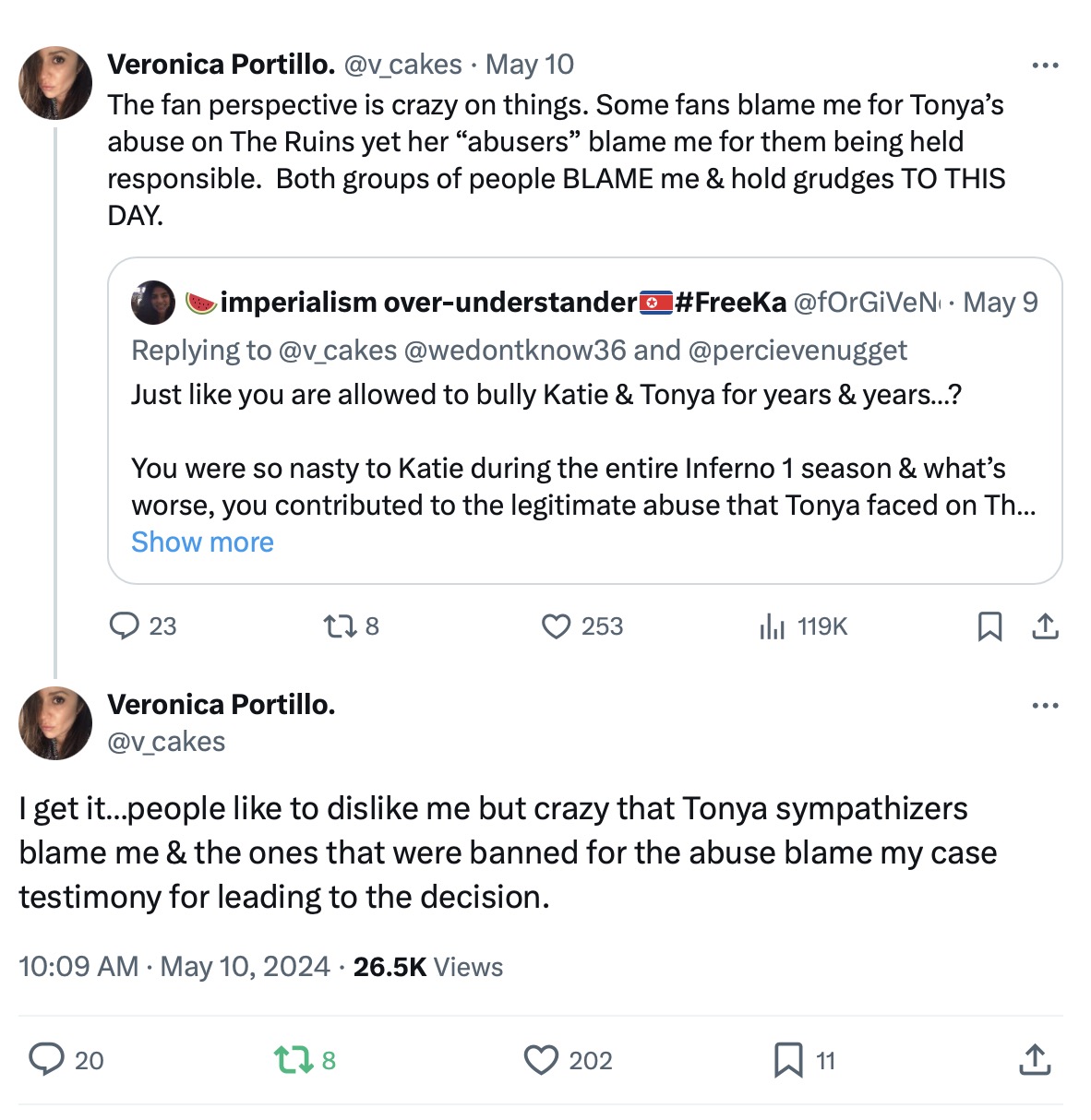 *My thoughts: Veronica has publicly stated that “the accused” blame her “case testimony” for getting banned. This seems like a fairly public statement — and she was on The Ruins with Tonya. However, it’s a recent claim, so Sarah and Susie may not have been aware of it.