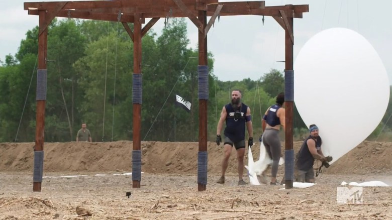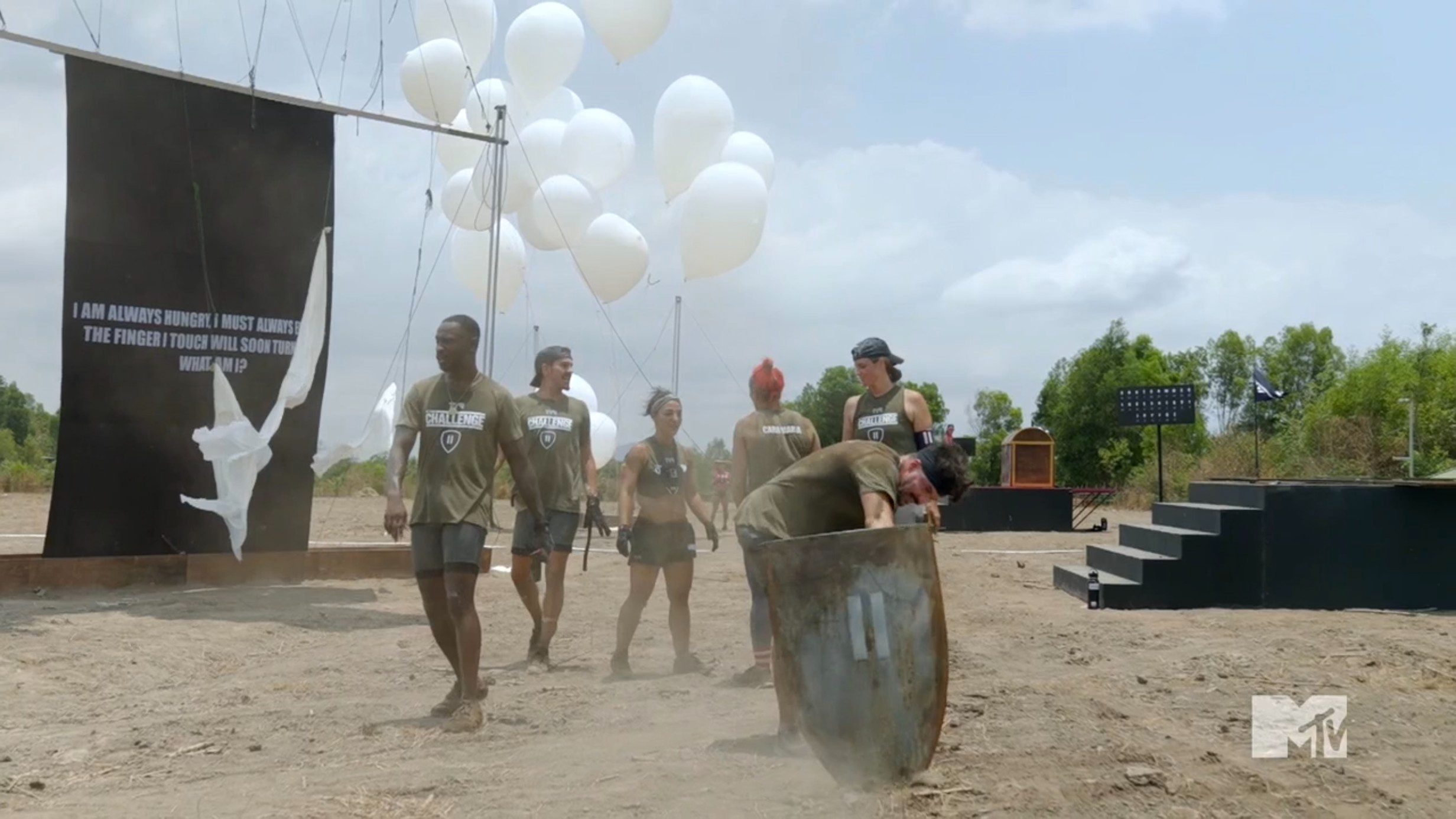 The daily challenge is called Cloud Catchers, and the goal is to race through an obstacle course and retrieve large, helium-filled balloons. Once all the balloons are attached to the team’s base, it will raise a banner and reveal a riddle. The team that solves the riddle the fastest with the most in-tact balloons will win. The competitors quickly realize that protecting the balloons is more important than speed, but one person who didn’t get that memo is Derrick. He jumps into a muddy ditch and hurts his leg. He’s screaming in pain, worried his leg is broken, but realizes he still needs to help his team. A lot of balloons are popping, and many players are getting frustrated — but one person who isn’t overcome by frustration is Cara Maria. She refuses to throw the challenge, even though it would guarantee Laurel goes into the Arena, and she is helping Era 2 take the lead.