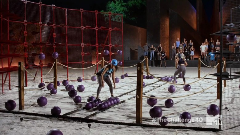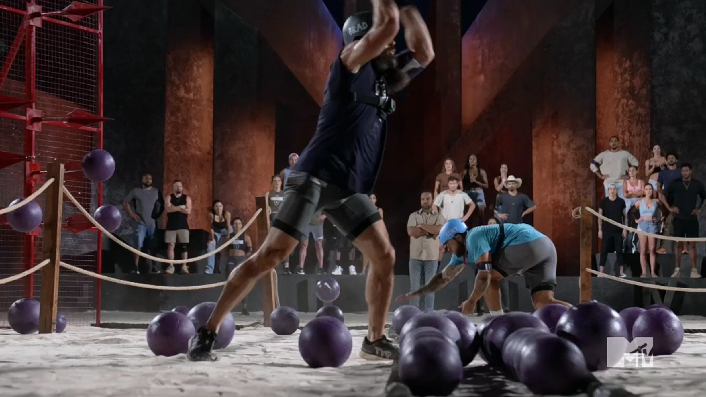 At the Arena, Cory & Jonna are named as Brad & Rachel’s opponents, and they’re playing To the Point. There’s a line of balls and each player has a wall of spikes behind them. The goal is to throw as many balls as possible so they’re lodged on their opponent’s spikes. Competitors can play defense or offense, but whoever has the most balls stuck on their spikes once all balls are out of bounds loses. Brad and Cory start by playing offense, not trying to protect their spikes, and they soon realize it’s not super easy to get a ball on the spikes. They’re missing a lot of throws, but Cory gets three balls on spikes before Brad gets his first one. Eventually, the score is 4-3 with Cory in the lead. Brad is trying to get another point, but Cory is just ensuring the balls go out of bounds. This strategy works, and it allows Cory to win and get back into the game.