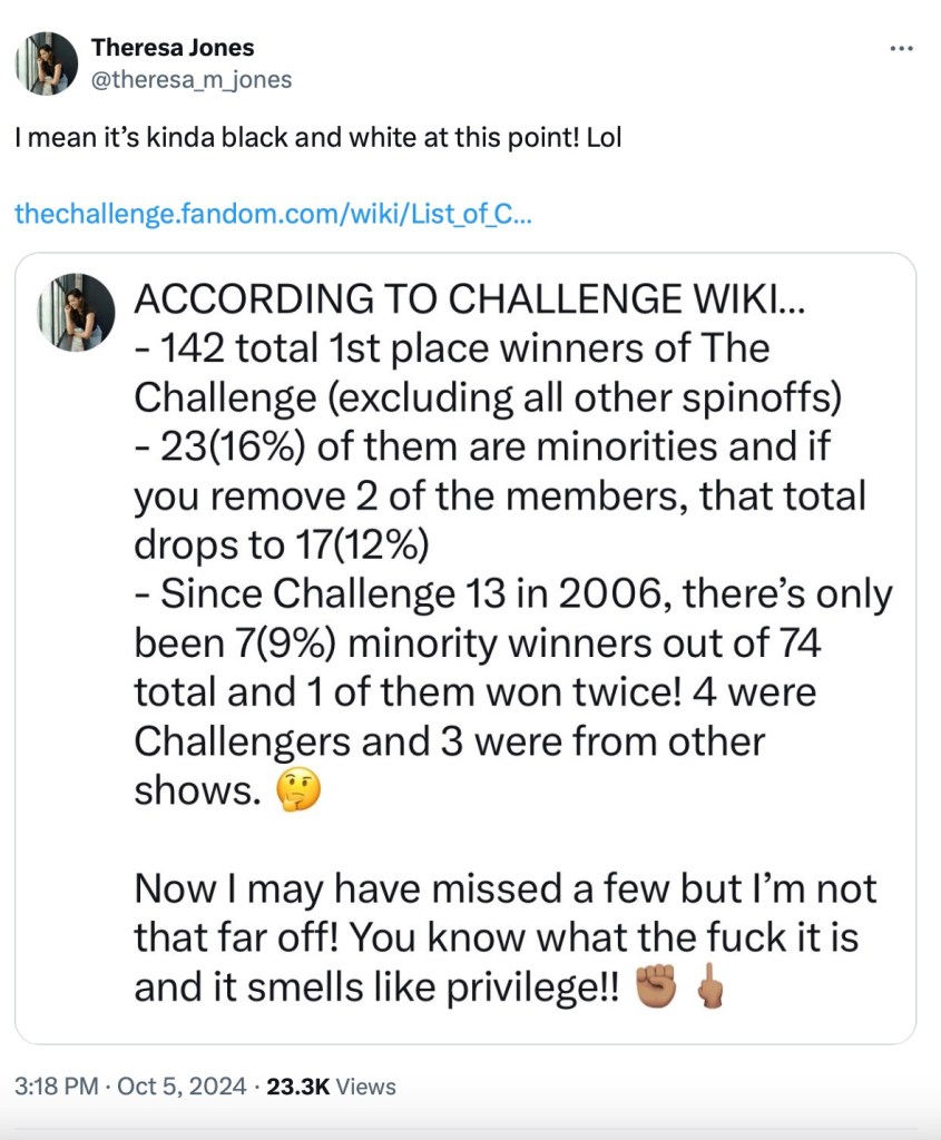 Seemingly out of the blue, Theresa made a Challenge-related post. She broke down some statistics about the main series of the show, noting the overwhelming number of white winners on the main series.