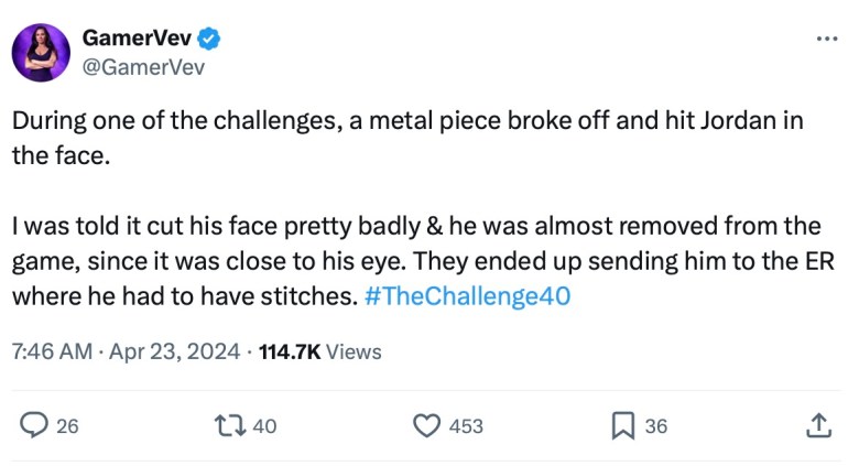 In the edited version of the show, we’re meant to believe Jordan got the injuries being pushed to the ground. During filming, spoiler account Gamer revealed rumors that Jordan was pretty severely injured because a piece of metal broke off and cut his face. It was also alleged that Jordan was almost taken out of the game because the injuries were near the eye and required stitches.