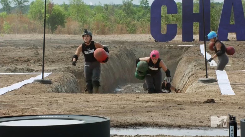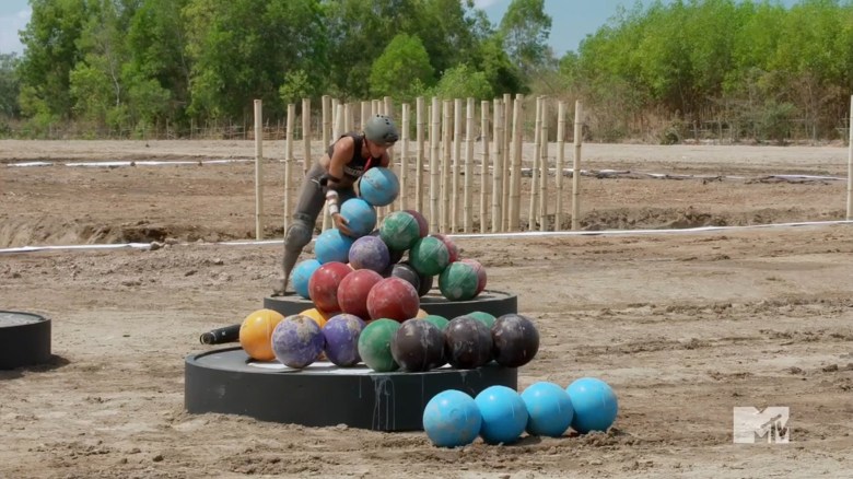 The cast arrives at the challenge and they see balls, mud, and a giant “40” carved into the field. The game is called 40 Yard Dash and competitors must run through the craved path and its obstacles to retrieve six puzzle pieces. Once all pieces are collected, they must use them to assemble a pyramid. Michele is given a one-minute penalty because she came in second-to-last in Duned, so she’s already behind the rest of the girls. The obstacles include a mud pit, maneuvering through bamboo chutes, crawling under a net, and climbing over barrels of hay. Jordan is the first person to collect all six puzzle pieces, but Jenny isn’t far behind. However, no one can see how these balls fit together to make a pyramid, and many people call for a check when their puzzles are comically wrong.