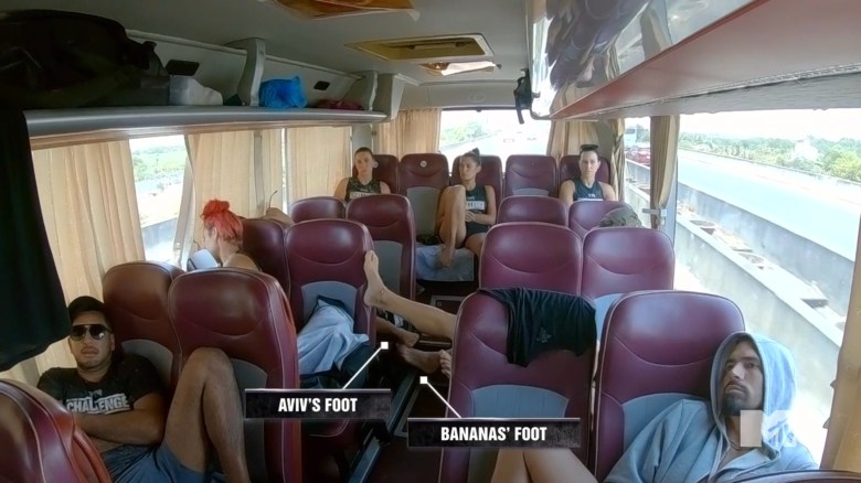 The Bananas Angels alliance have a weird habit of giving each other foot massages and playing footsie. On the bus ride home from the Challenge, Bananas and Aviv are touching toes, and Michele jokingly asks if she can join. She knows she’s playing with fire, but she doesn’t have anything to lose. Michele’s question implies that this is an inappropriate, somewhat sexual action, and it’s “bad optics” for someone in a relationship to do this. Bananas knows this is just an innocent, playful action, and gets mad that Michele is resorting to low-blows to make waves in the game. It’s especially rude to bring Aviv (the one who’s actually married) into the mix, because her real-life relationship could be damaged by a petty game move. However, Cara Maria defends Michele, claiming “it’s not cute” for Bananas to be yelling at a girl.