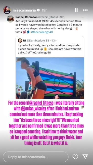 Theoretically, if Jenny’s win didn’t count, the second-place finisher would have taken the winning spot. This would have been Cara Maria, but she also had a 3-minute penalty. Rachel claims she finished about 45 seconds behind Cara, so Rachel believes she would have won. In her Instagram Story, Cara Maria believed Rachel’s timing was off. She said that she counted to three minutes with Jordan on the sidelines after finishing the puzzle, confirming she earned second place even when you factor in her penalty.