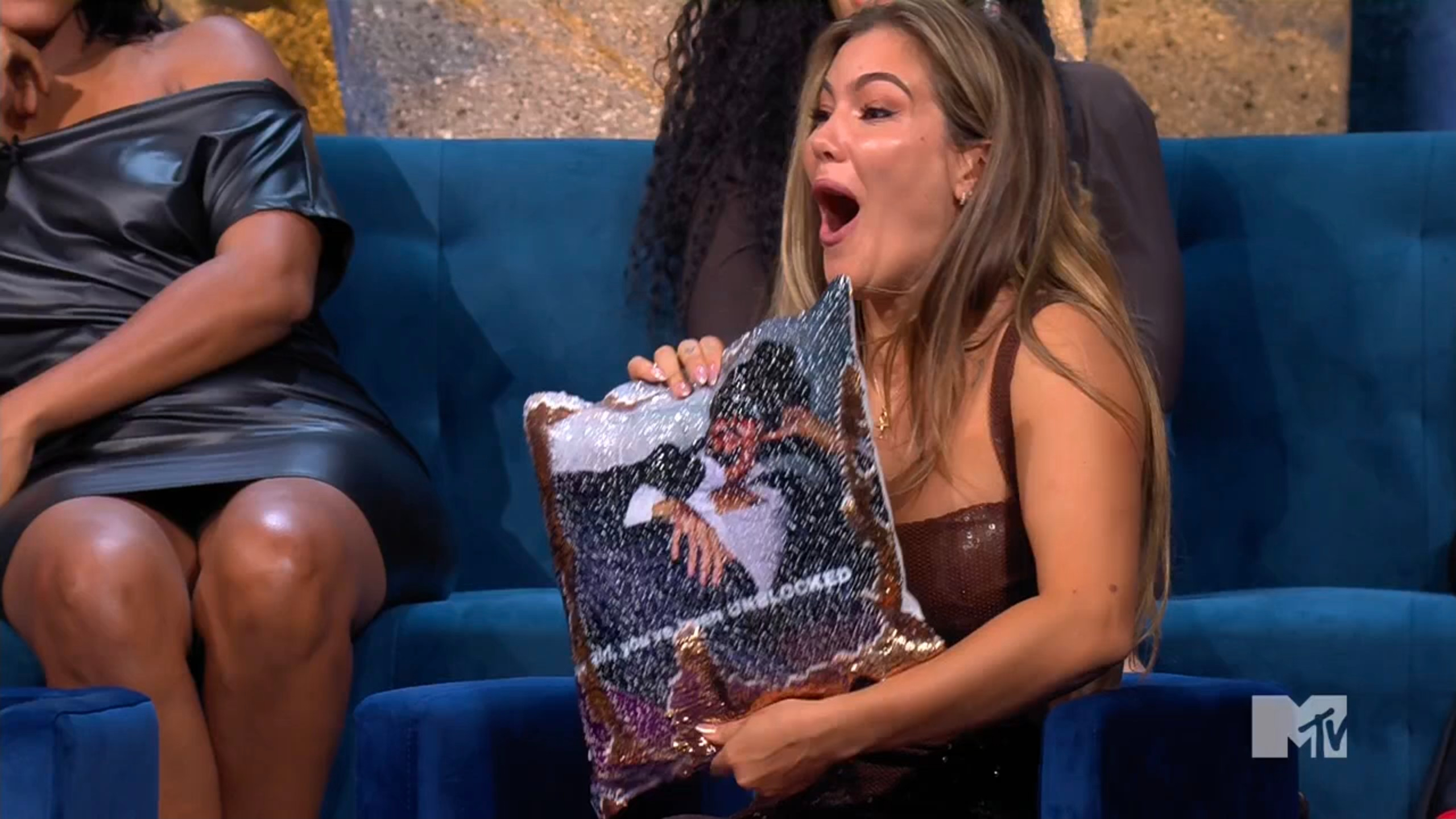 We look at Tori and Cara Maria’s relationship and how it’s evolved over time. Tori claims Cara Maria taught her the game on Dirty Thirty, and then their relationship got strained, but when Cara Maria returned this season she was vulnerable and reignited their friendship. Bananas says the rivalry started because Jordan proposed to Tori, and Paulie wanted to make that move on War of the Worlds 2, but Tori laughs and denies that. Cara Maria claims that Tori gave her a gift this season by eliminating her before the grueling final, so Cara gives Tori a gift. It’s a sequined pillow of Cara as her drag persona “Carl” with the message “You’ve been unblocked.”