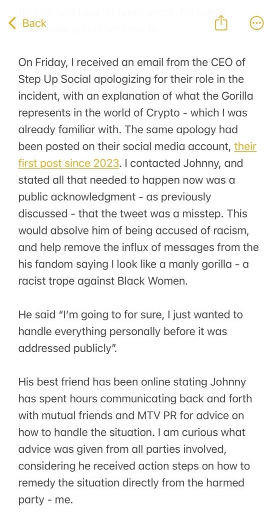Apparently Bananas was working to apologize behind the scenes, including calling Taylor (Receipts 2 + 3). Taylor stated she didn’t think the intent of the tweet was to be racist; she understood the gorilla emoji has a different meaning in the crypto world.