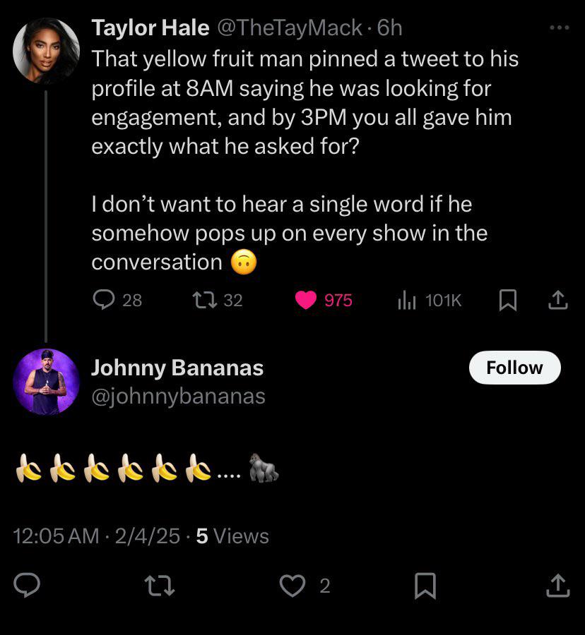 Bananas ruffled Taylor’s feathers while talking about reality shows, so when Taylor called out Bananas for trying to promote his cryptocurrency, Bananas chimed back with emojis of bananas and a gorilla chasing it (Receipt 1).