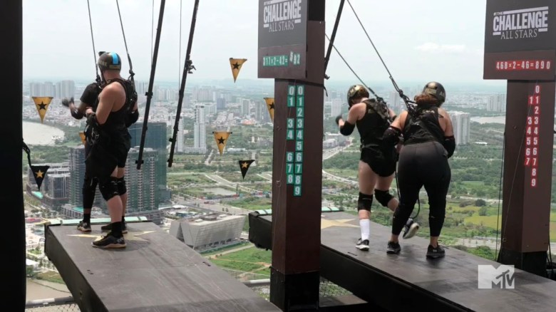 Ashley wanted to compete. She was trying to pull Aneesa across the platform and was willing to be suspended over the edge to grab flags, but her partner wanted nothing to do with it. During this challenge, teams were tethered together, so if one person fell, the other would have to bungee too.