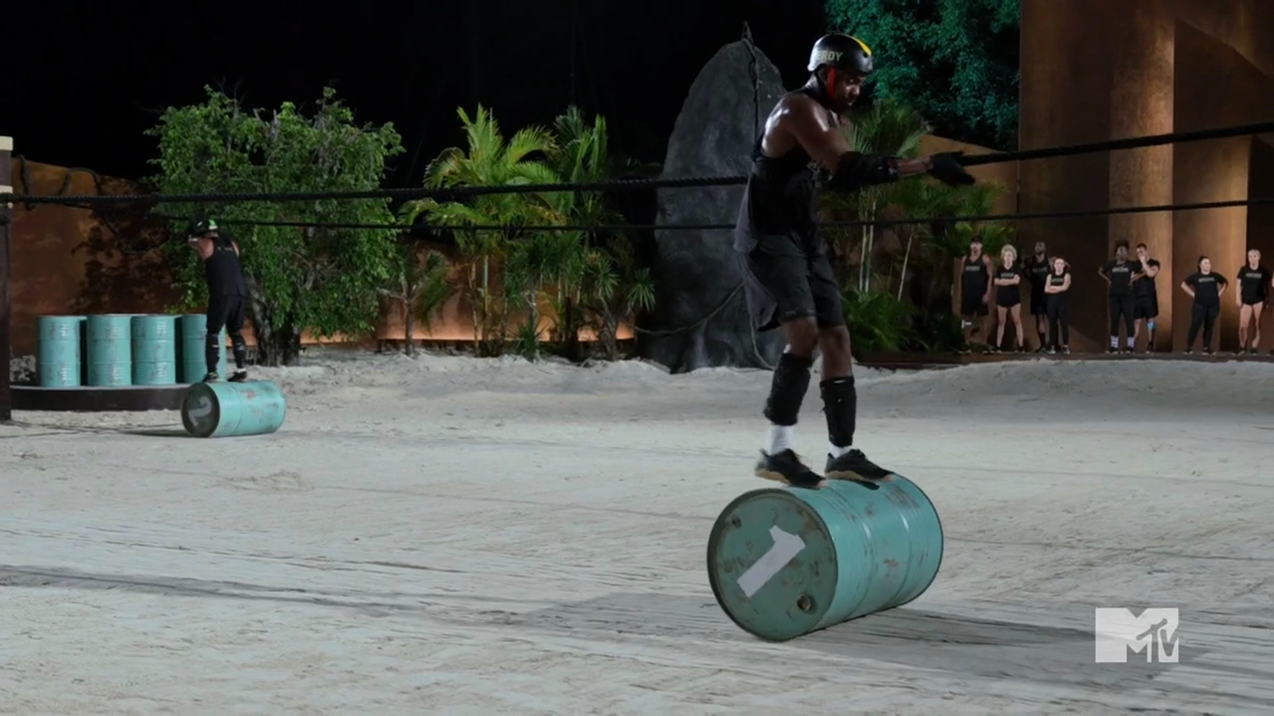 The elimination is called Over the Barrel and competitors need to stand on barrels and roll them across the Jungle without touching the sand, though they have a rope to use for balance. Once all 18 barrels are transported, the teams need to rearrange them to solve two math puzzles. The goal is to make triangles around a center barrel where the sums of each side equal the center number. Immediately, Leroy stumbles but Adam seems comfortable on the barrels. The Road Rules team takes a slight early lead, but Devin & Leroy aren’t far behind. This lead is maintained until the puzzle, but it’s clear that the puzzles will be the deciding factor. Steve is the first to solve his puzzle, while Devin & Leroy are still working. This allows Steve to help his confused partner, and Adam & Steve win again. Now, Devin & Leroy are going home, but we don’t know the fate of their star.