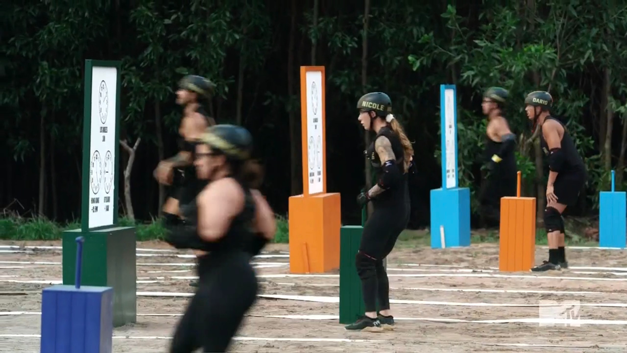 The daily challenge is called Blow Your Mind, and it’s just for power, not a star. The field is divided into eight lanes, and the partners start on opposite ends. They need to memorize answer keys with times on them. Then, they’ll detonate their answer keys, which incinerates them, and they meet in the middle to solve a puzzle. Some people are very confident in their ability to memorize times while other people, like Faysal, don’t know what an analog clock is. Some people race through answer keys, and many people realize their memory isn’t great — plus the puzzle is kind of confusing. Dario decides to just call for a check, which causes a chain reaction and many teams clock in their answers without verifying the accuracy. However, Shane and Veronica take their time because they know how time zones works. This is a smart move, because they both have the most accurate answers, but Katie & Veronica secure the win.