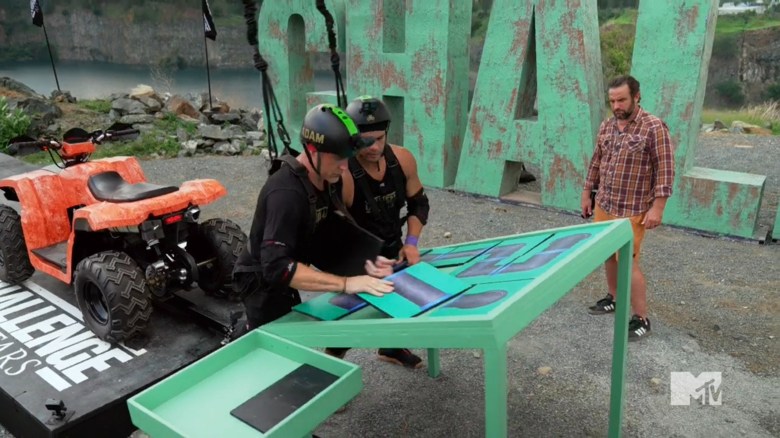 The daily challenge is called Shooting for the Star and the cast sees an ATV right by a cliff. First, teams must solve a puzzle. Then, they need to ride the ATV off a cliff to stop their time by hitting a star. Basically, the vehicle and cliff-jump are just theatrics and this is purely a puzzle. Frank & Sam kick things off, and Sam thinks they do well, but Frank knows their time isn’t great. Ashley & Dario and Nany & Turbo prove this to be true, because they finish the competition quickly. The rest of the teams go, and some of them do well, although the girl/girl teams are too short to touch the star. When the times are crunched, Steve & Adam pull out the win, and they celebrate, but all of the other star-holding teams are nervous.