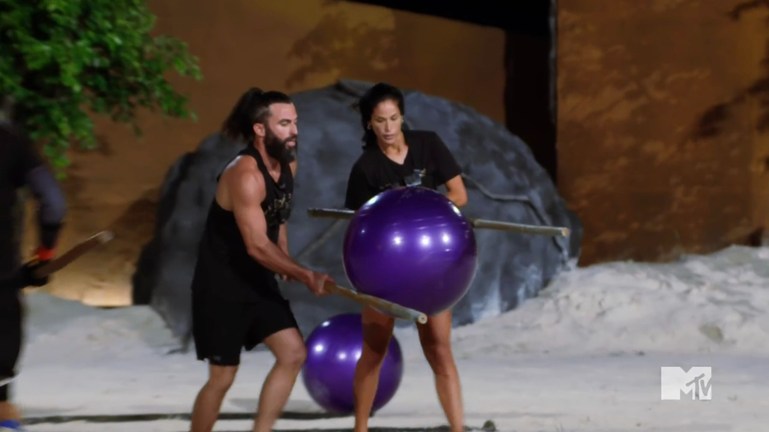 The Jungle Game is called Star Bluff. The teams start with a game of lies. They’re given chests that may or may not have stars in them, and they get to ask their opponents a series of questions. Then, they must guess whether their opponents are bluffing or not. It’s an interesting concept, but it turns into a joke. It results in Nany & Turbo getting two points and Adam & Steve getting three. Then, the teams have to transfer big yoga balls using bamboo chutes like chopsticks. Nany & Turbo get two balls pre-placed in their goal because of the bluffing round and Adam & Steve have three replaced. Adam & Steve seem comfortable from the beginning and they immediately develop a rhythm. Nany & Turbo struggle at first, then Turbo’s strategy is to go fast. It works sometimes, but it leads to some mistakes. In the end, Adam & Steve had the right approach. They retain their star, and all four remaining teams are heading to the final.