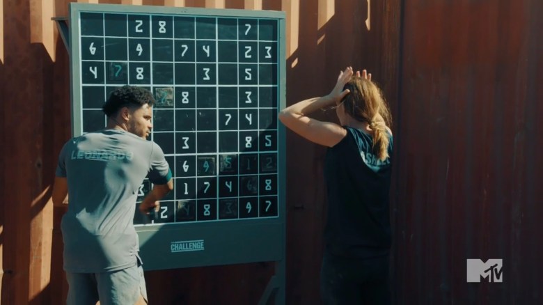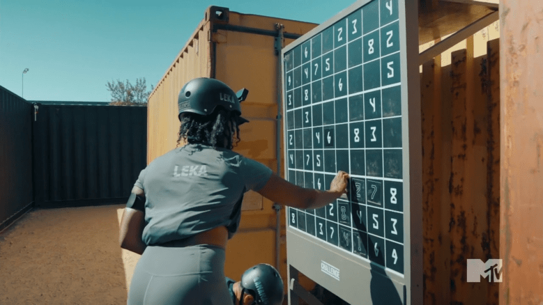 The cast is back after Nia’s DQ, and people are scrambling because Bananas is not the Hangnail — but we get to the daily Challenge quickly. The game is called Amazed and the cast needs to rush through a maze made of 100 shipping containers. In two heats, the teams need to rush in and find a Sudoku puzzle to complete — the harder ones are closer to the start and the easier ones are farther. Once completed, the pairs will run out of the maze and stop their time. The teams that get the most correct answers the fastest will win. Some teams are excited, like CT and Adrienne, because Adrienne loves Sudoku. Other people are less excited, like Justin who was more into cheerleading than math in school. Then, we have Ashley & Leo, where Leo learned about Sudoku yesterday but chimes into Ashley’s process a lot, frustrating her.