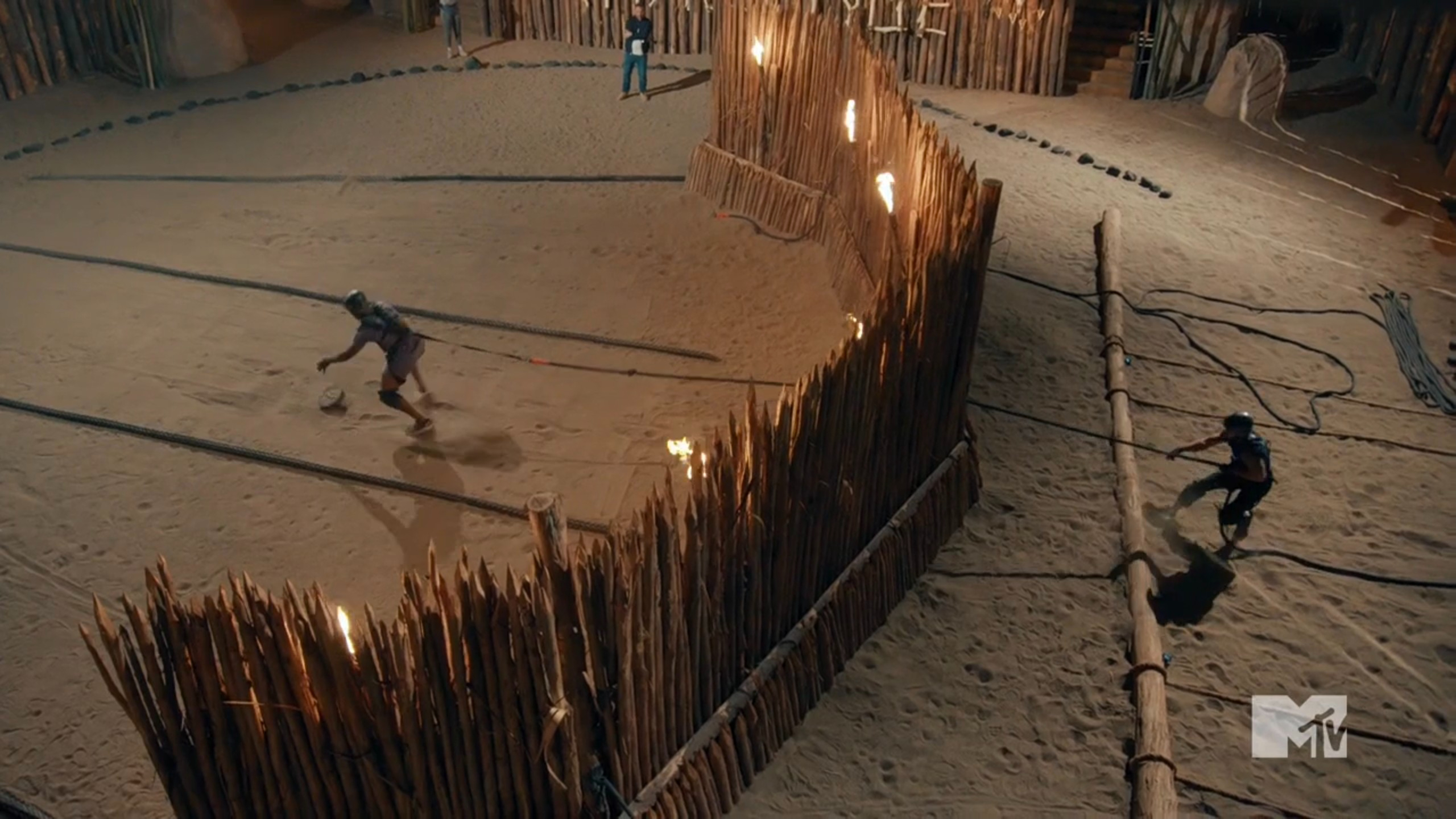 The cast walks into the Arena, and they see a wall made of spiked wood. The game is called Hold Em Back and the wall is curved with three ropes going through it and three corresponding tokens. One player, the offense, will hook themselves to the ropes and deposit the three tokens into baskets. The defense will be pulling the ropes, somewhat blindly, to pull the offensive player back and prevent him from scoring. Bananas plays offense first, and he realizes how strong Gabe is. So, his strategy is to keep switching ropes and make progress while Gabe is catching up. This is fairly effective for the first two tokens, but he has to inch his way to completion for the final token. Eventually he gets there, but it takes a while. Then, Gabe goes and he has great speed. He gets two tokens deposited quickly, but Bananas is pulling him to prevent him from getting his final token in the basket. It doesn’t matter much, and Gabe “grizzly bear” walks to the basket and puts his final token in there, sending Bananas home.