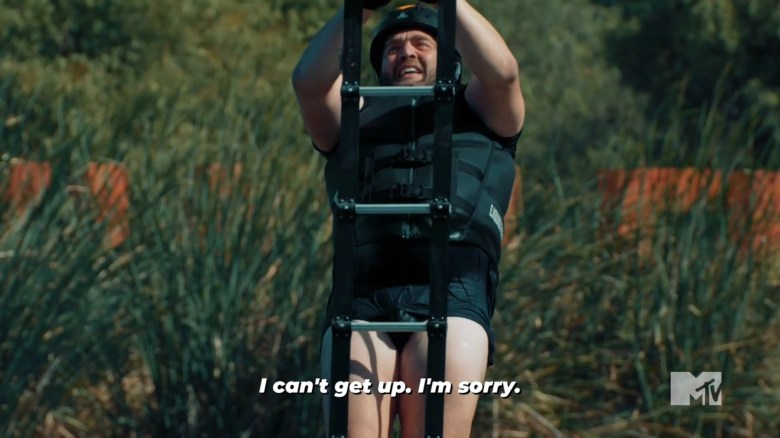 We quickly head to the daily challenge, and we see a Challenge classic: heights over water. The game is called Runes My Life. Competitors need to swim to a structure in the water and climb rope ladders and pegged walls while collecting runes. These runes are used as puzzle pieces and once the puzzle is completed, the teams will jump off the structure and swim back to a raft and stop their time. In the first heat, Aneesa & Gabe seem to be moving at an OK pace, and Gabe is helping Aneesa, but CT & Leka are taking it slow. CT is scared after he hurt his back on Battle of the Eras, and he doesn’t want to climb the ladder. The rookies believe CT is throwing the challenge, while the veterans are shocked that he’s not the same beast we’ve come to know. Specifically, Turbo is upset because he’s watching Leka do all the work while CT splashes in the water. Somehow, Leka finishes the puzzle before Aneesa & Gabe, but CT never made any progress.