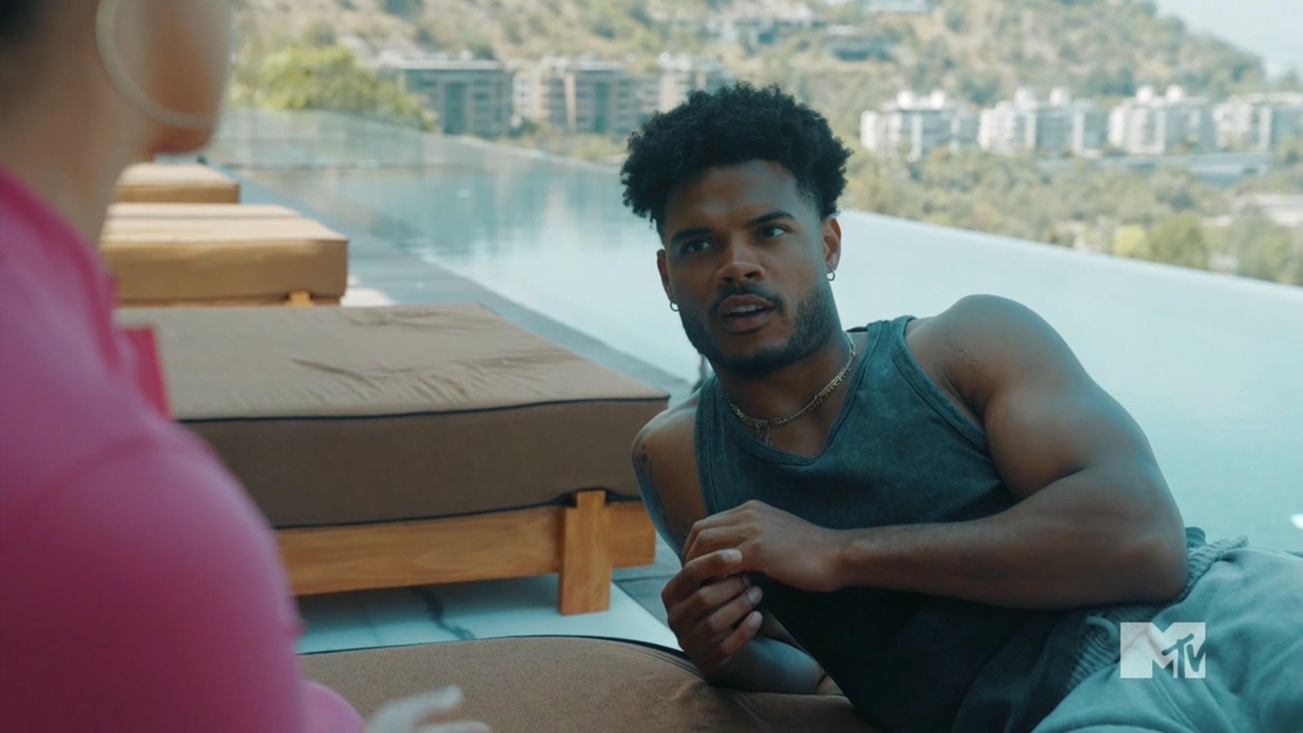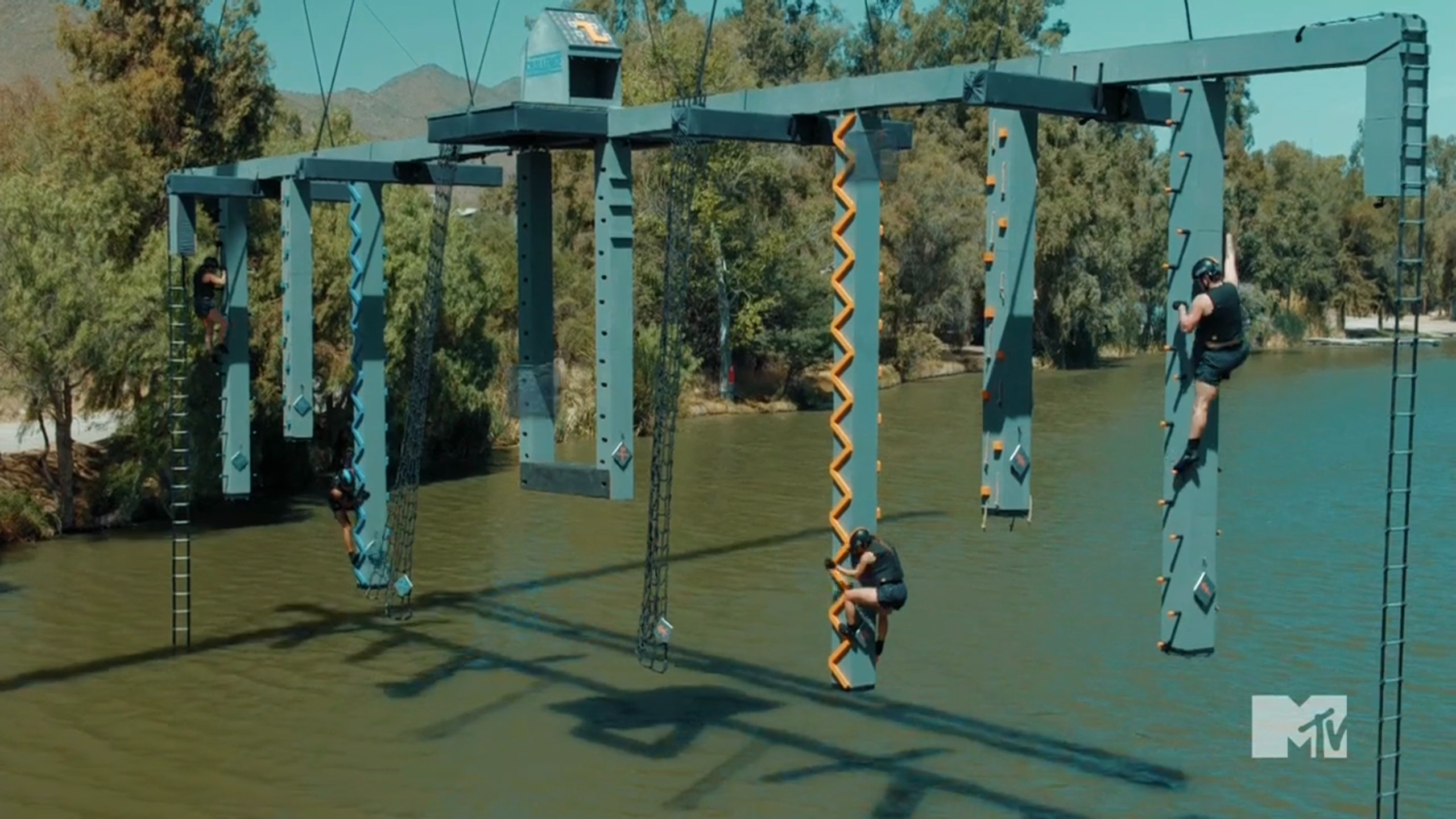 We quickly head to the daily challenge, and we see a Challenge classic: heights over water. The game is called Runes My Life. Competitors need to swim to a structure in the water and climb rope ladders and pegged walls while collecting runes. These runes are used as puzzle pieces and once the puzzle is completed, the teams will jump off the structure and swim back to a raft and stop their time. In the first heat, Aneesa & Gabe seem to be moving at an OK pace, and Gabe is helping Aneesa, but CT & Leka are taking it slow. CT is scared after he hurt his back on Battle of the Eras, and he doesn’t want to climb the ladder. The rookies believe CT is throwing the challenge, while the veterans are shocked that he’s not the same beast we’ve come to know. Specifically, Turbo is upset because he’s watching Leka do all the work while CT splashes in the water. Somehow, Leka finishes the puzzle before Aneesa & Gabe, but CT never made any progress.