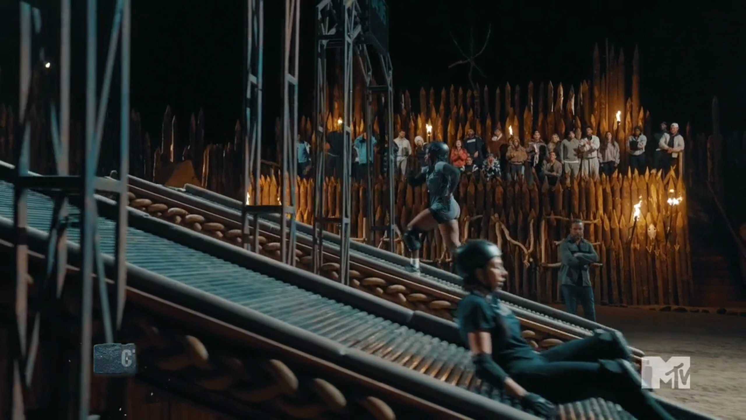 At The Arena Leka and Olivia will be facing each other in Out of Time. There are two ramps made of rollers and the competitors have five minutes to climb their ramp, jump over it, and hit a buzzer. Then, they need to climb up the ladder on the back of the ramp, run down it, and hit another buzzer. Whoever rings the buzzer the most times will win. At the beginning, Leka has a quick lead. Olivia seems to stumble a couple of times, but Leka starts to slow a little bit. According to Derek, Olivia has crazy endurance, and this starts showing about halfway through the game. Leka stalls while climbing the ramp, and this is where Olivia passes her. In the final minute, Leka is so gassed that she’s crawling, but Olivia is keeping a decent pace, which allows her to take the win.