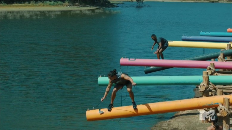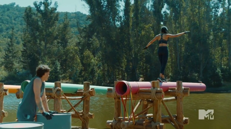 This week’s challenge is called Band Together, and it’s a balancing act. Each team has a wobbly pole suspended over water. The goal is to stabilize that pole, walk down it, and grab a flag at the end. To do this, teams will need to run down a field and obtain resistance bands, which are wrapped on heavy items. Bringing back the heavy items will accumulate more bands which will create more stability. In the first lap, all of the men carry back barrels (which have the most resistance bands) while the girls sit on their poles and make jokes. Then, the girls go and some of them manage to bring back barrels while other girls bring back lighter items with lighter bands. Aviv makes the mistake of carrying a heavy barrel, which slows her down significantly. Eventually, some of the lighter girls try to get across their poles like Nany and Dee. Nany falls into the water, but Dee goes very slowly. Eventually, she reaches the end of her beam and reels in the flag. She gets it, shimmies back, and Derrick & Dee win the challenge.