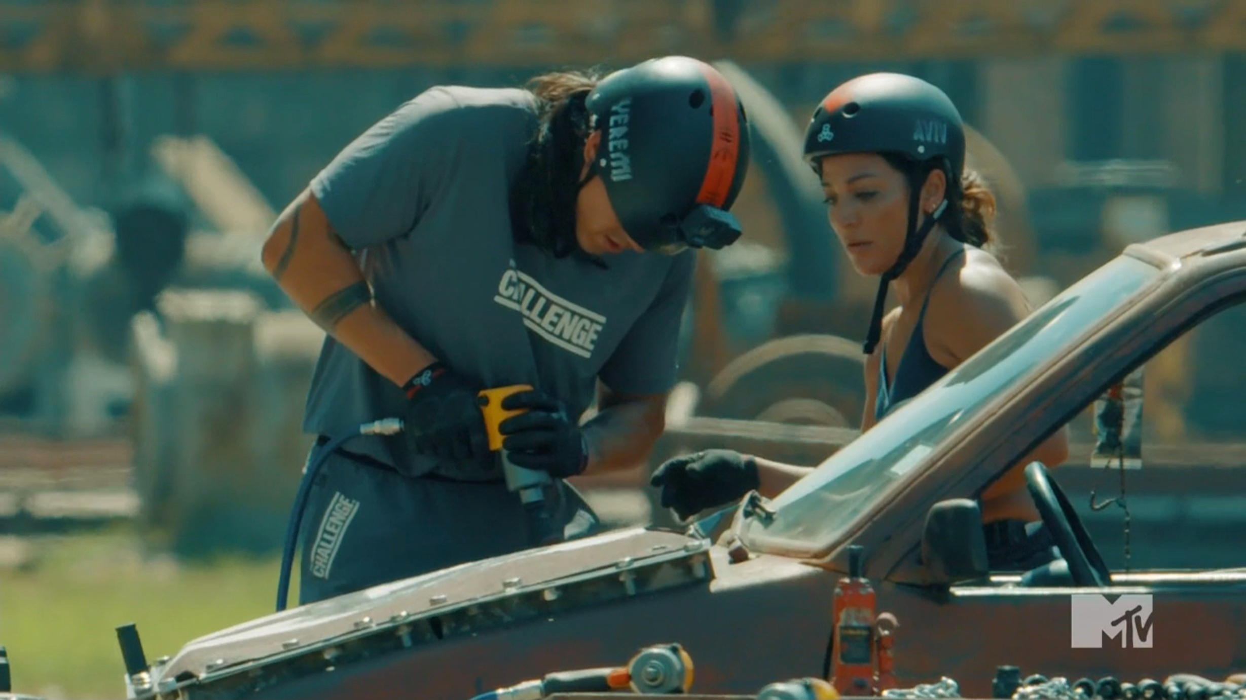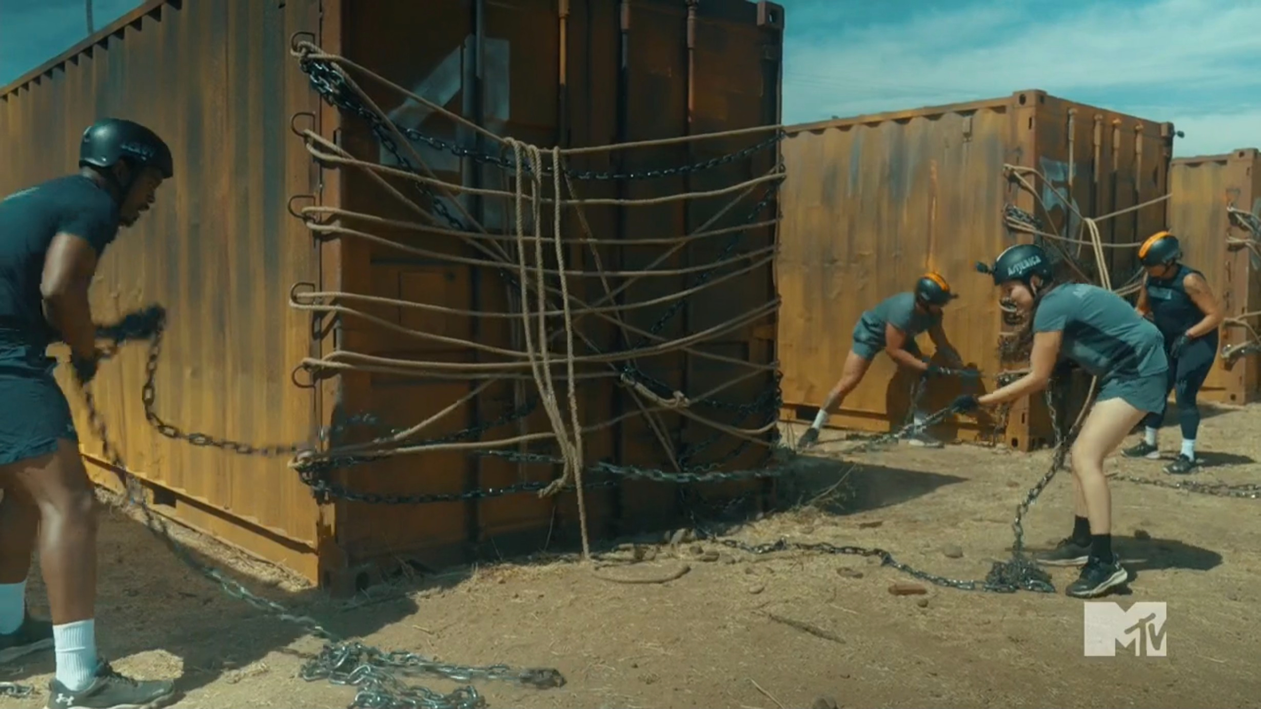 This week’s challenge is inspired by the movie The Running Man, and Glen Powell kicks off the competition with a message. Fittingly, this game is called Running Man and TJ gives each team a key. The partners will need to run down a field and find a shipping container that has a lock for their key. They need to open that container, which is wrapped in chains and ropes, and release a car. They’ll then drive the car to a working station and use tools to remove the hood and release a tracking device. Finally, the competitors will run the tracking device to the finish line before it detonates to clock their time. The duos quickly find their containers, but Olivia & Will seem to struggle to work together while removing the chains from their box. Yeremi & Aviv are the first team to get to their car, with Michaela & Cedric close behind — and they discover the car is a manual. This proves to be an issue for some teams, specifically Justin & Nany who resort to pushing their car.