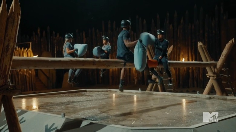 The Arena game is called Bad Dreams. There are two beams suspended over mud, and the competitors have “weapons” to attack their opponents. If your opponent falls off or drops their weapon, you win. But, to score a point, both opponents need to win the round, and the guys and girls are separated. In the first round, we discover that pillows are the weapons. Derrick falls in one second, but Dee eventually knocks Adrienne off, so no points are scored. The same thing happens in the second heat… and then the third heat…and then the fourth heat. It comes down to the fifth round, and Derrick falls into the water, but the girls don’t fall off. So, the game moves into a sudden death round. TJ flips a coin, and the boys will be competing against each other. As expected, Derrick falls off again, and Theo & Adrienne take home the victory.