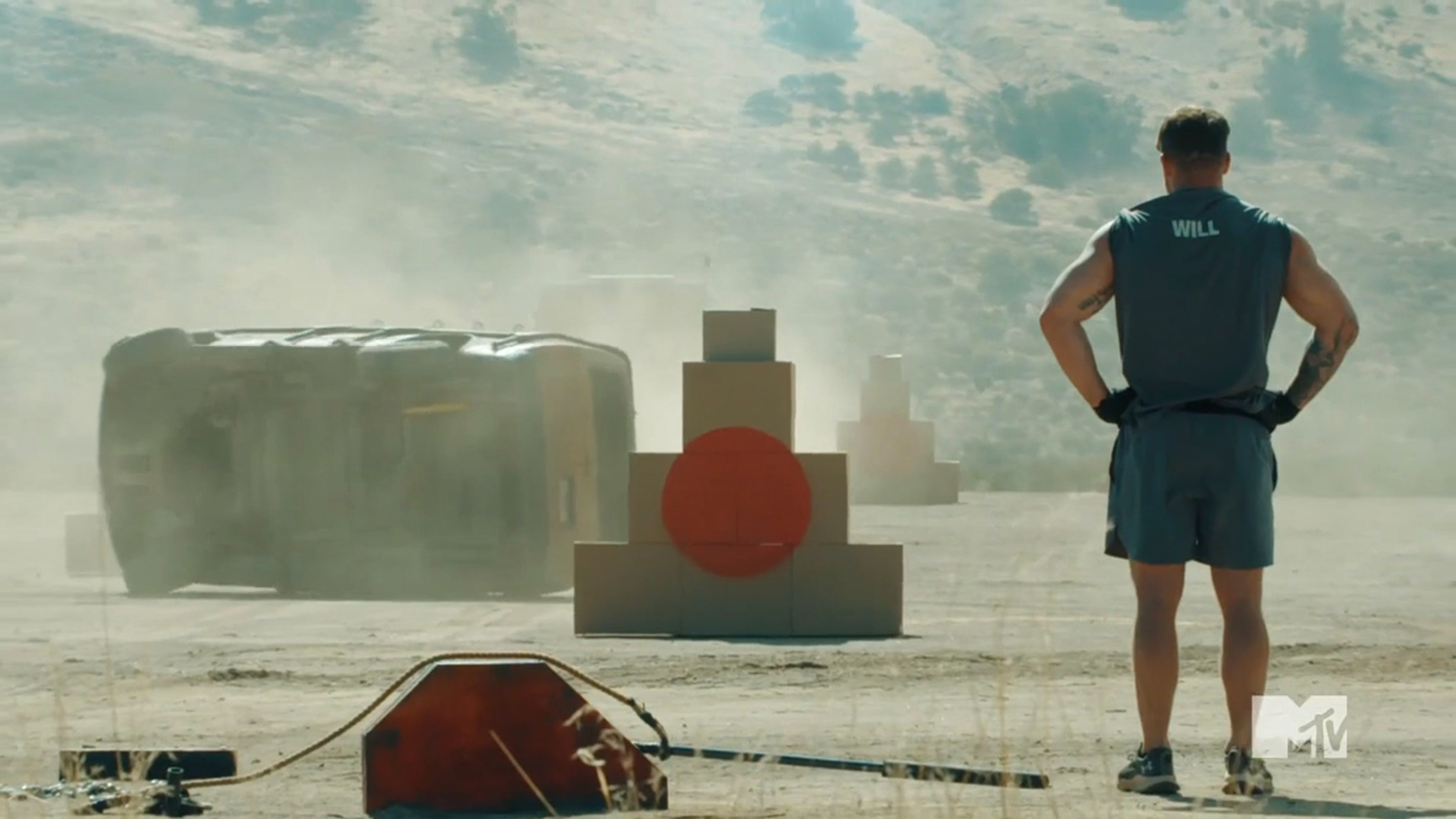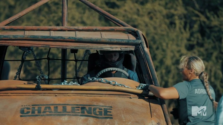 After scheming to control the numbers, the cast heads to the daily challenge, Derby Drifter. Each team has a van covered in chains, and one partner needs to unwrap the vehicle. Once the chains are fully off, the van will be attached to a tow rig and the time will be stopped. The other teammate is inside the van and will be the driver who’s pulled by a truck at 25 mph. The driver needs to navigate to the outside of “gates” (which are just stacks of boxes), and for each gate successfully cleared, 30 seconds will be knocked off the team’s time. Justin & Nany go first, and they move quickly, setting the pace. Nany clears four of the five gates, but she realizes that navigation can be difficult because the van is chained to the tow truck. Will & Olivia compete second, and Will pulls the chains with ease. Olivia drives the van and finds out the hard way that the chain doesn’t allow for much slack. She gets pulled by the tow truck, and her van tips on the side, so her team only clears one gate.