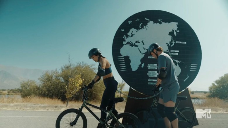 The teams are playing Global Exchange, and there are two maps of the world separated by 1 kilometer. One map has Africa, Europe, Asia, and Oceania; the other has North America and South America. Each map has multiple countries on it, but some of them are placed incorrectly. So, the teams may need to transfer countries (one at a time) while partners are tethered together and riding BMX bikes, which could be an issue for Turbo because he doesn’t know how to ride a bike. However, many of the cast members have no knowledge of world geography, or in Nany’s case, she just knows the places she’s visited to film Challenge seasons. Theo seems to be confident in his knowledge (which doesn’t mean he’s right), while Sydney has been to 65 countries and Yeremi knows some European and South American countries. There’s no hope for anyone to get 100%, so TJ eventually sounds the horn. Turbo & Sydney have the most correct answers, so they earn safety. As it turns out Cedric & Michaela finish in last, so they’re heading straight into The Arena.