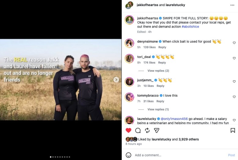 Naturally, when Laurel is involved, Cara Maria will get dragged into the conversation. While most of the Challenge cast members didn’t engage with comments about her, Jakk did call her “maga Captain Jakk Sparrow.”