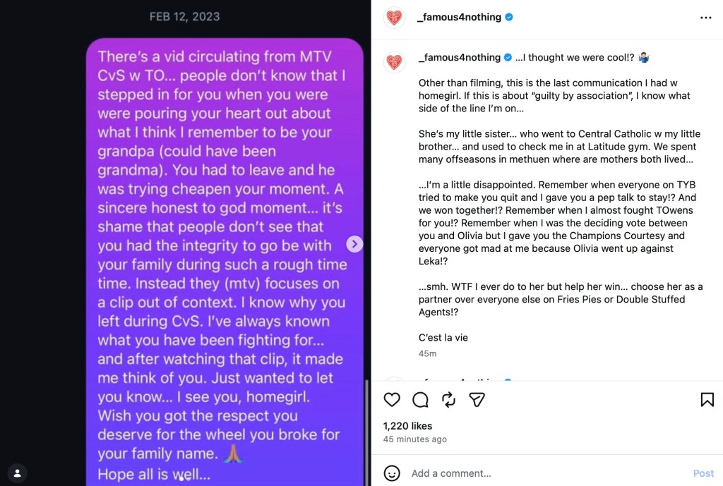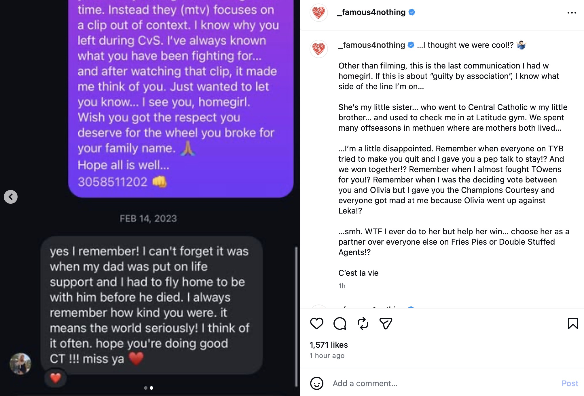 While Ashley seems to say she’s retired, CT is upset by her public statements. He claims he “never voted for anythings besides The Challenge,” implying Ashley was incorrectly stating his political affiliation. CT later posted an Instagram post where he expressed disappointment and claimed he always supported Ashley.